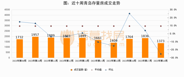 存量房方面,第18周青岛存量房成交1373套,较上周减少463套,环比下降25.2%。从近十周成交走势来看,周均成交套数为1730套,本周低于平均水平20.6%。