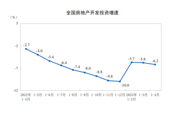 根据国家统计局数据,1-4月份,全国房地产开发投资35514亿元,同比下降6.2%,累计降幅较上月扩大0.4个百分点。