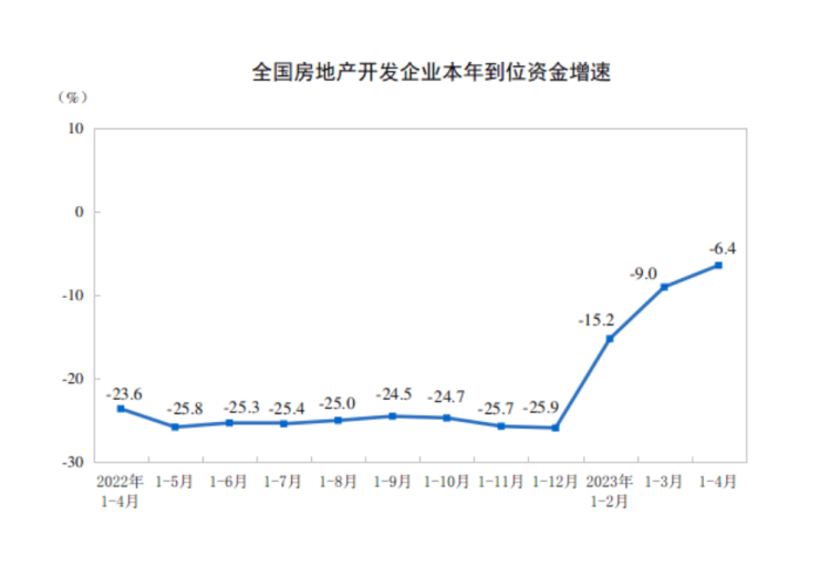 从房企资金看,受到市场销售改善影响,房地产开发企业资金紧张状况有所缓解,1-4月份,房地产开发企业到位资金同比下降6.4%,降幅比1-3月份收窄2.6个百分点。