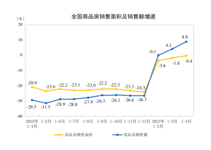 5月16日,国家统计局发布2023年1-4月份全国房地产市场基本情况,随着政策效应逐步显现,以及前期疫情积累的需求释放,1-4月份全国住宅销售面积及销售额均同比上涨。