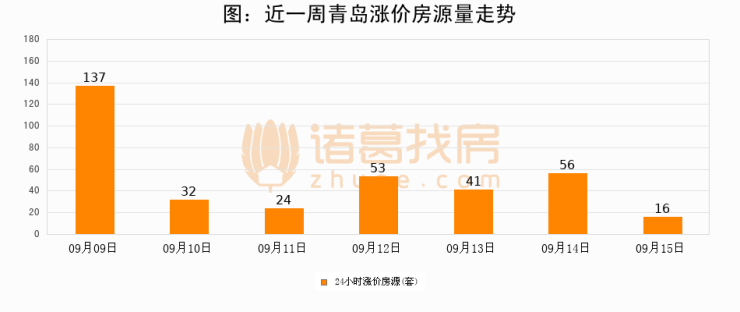 根据诸葛找房数据显示,青岛24小时涨价房源量为16套,较09月14日减少40套,环比下降71.4%。与此同时,涨价房源占比小幅回落,对于购房者来说是一个入市窗口期,购房者可抓住时机入市。