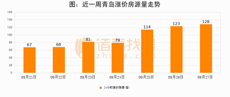 根据诸葛找房数据显示,青岛24小时涨价房源量为128套,较09月26日增加5套,环比上涨4.1%。与此同时,涨价房源占比小幅扩大,业主信心有所提升。