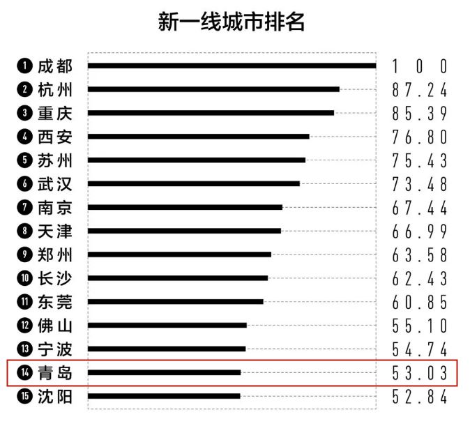 根据排名前列财经发布的《2021中国城市商业魅力排行榜》看,除四个一线城市外,在统计的15个新一线城市中,青岛排名第14位,仅略胜沈阳一筹。