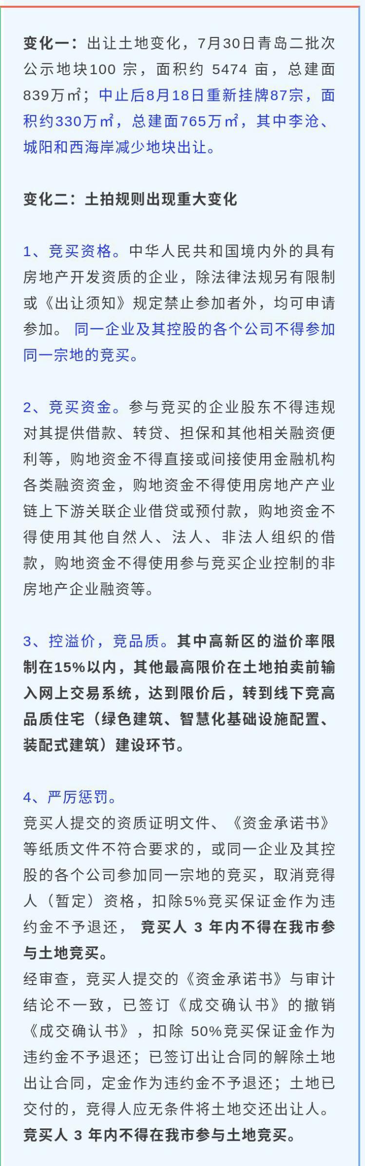 二是土拍规则变化,且严格规定了违背规则3年内不得在青岛拿地。