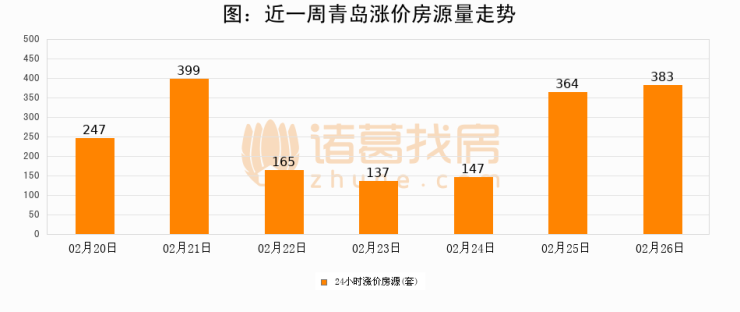 根据诸葛找房数据显示,青岛24小时涨价房源量为383套,较02月25日增加19套,环比上涨5.2%。与此同时,涨价房源占比小幅扩大,业主信心有所提升。