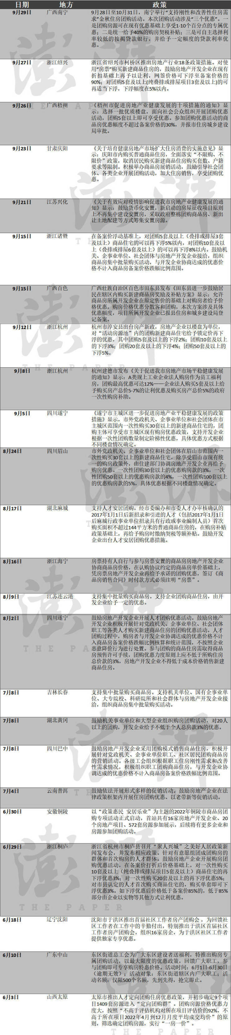 据澎湃新闻不完全统计,今年6月以来截至9月30日,至少包括山西太原、广东中山、辽宁沈阳、浙江桐庐、安徽铜陵、云南普洱、四川巴中、湖北黄冈、吉林长春、四川遂宁、江苏连云港、浙江海宁、湖北麻城、四川眉山、浙江杭州、广西百色、浙江诸暨、江苏兴化、甘肃庆阳、广西梧州、浙江绍兴、广西南宁等地发布“购房团购”相关政策或活动。