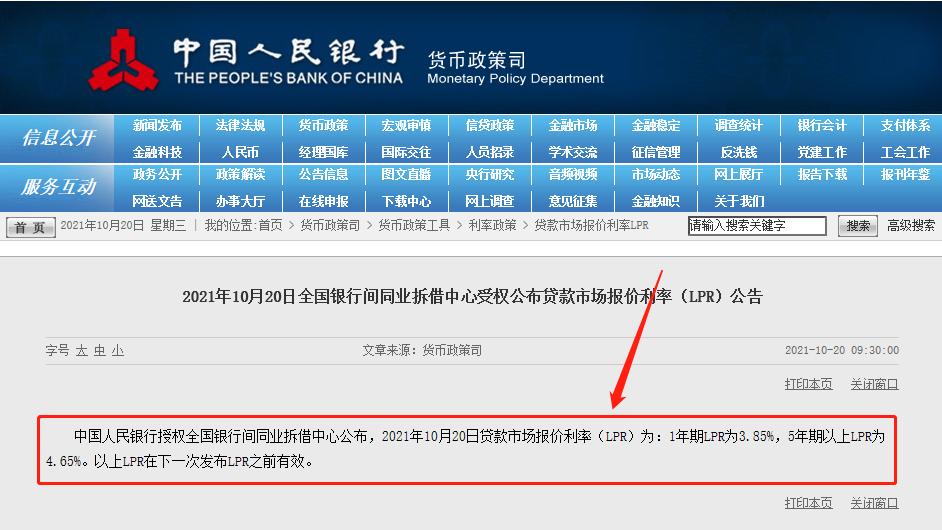 10月20日,中国人民银行授权全国银行间同业拆借中心公布较新一期的贷款市场报价利率(LPR),1年期LPR为3.85%,上次为3.85%;5年期以上LPR为4.65%,上次为4.65%,以上LPR在下一次发布LPR之前有效。