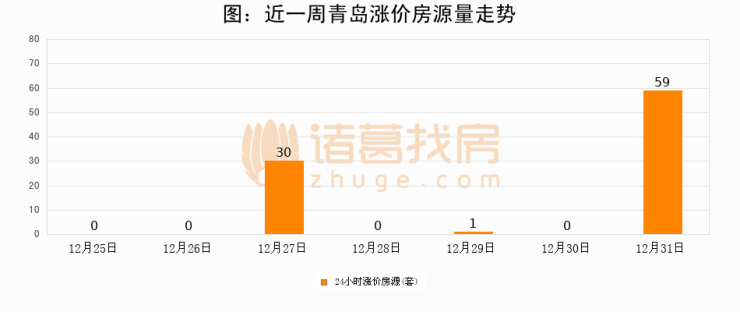 根据诸葛找房数据显示,青岛24小时涨价房源量为59套,较12月30日增加59套,环比上涨0%。与此同时,涨价房源占比小幅扩大,业主信心有所提升。