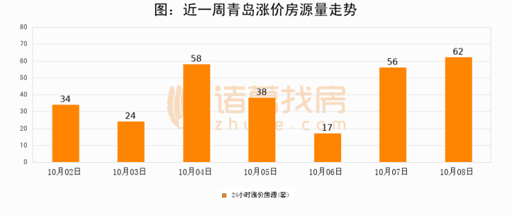 根据诸葛找房数据显示,青岛24小时涨价房源量为62套,较10月07日增加6套,环比上涨10.7%。与此同时,涨价房源占比小幅扩大,业主信心有所提升。