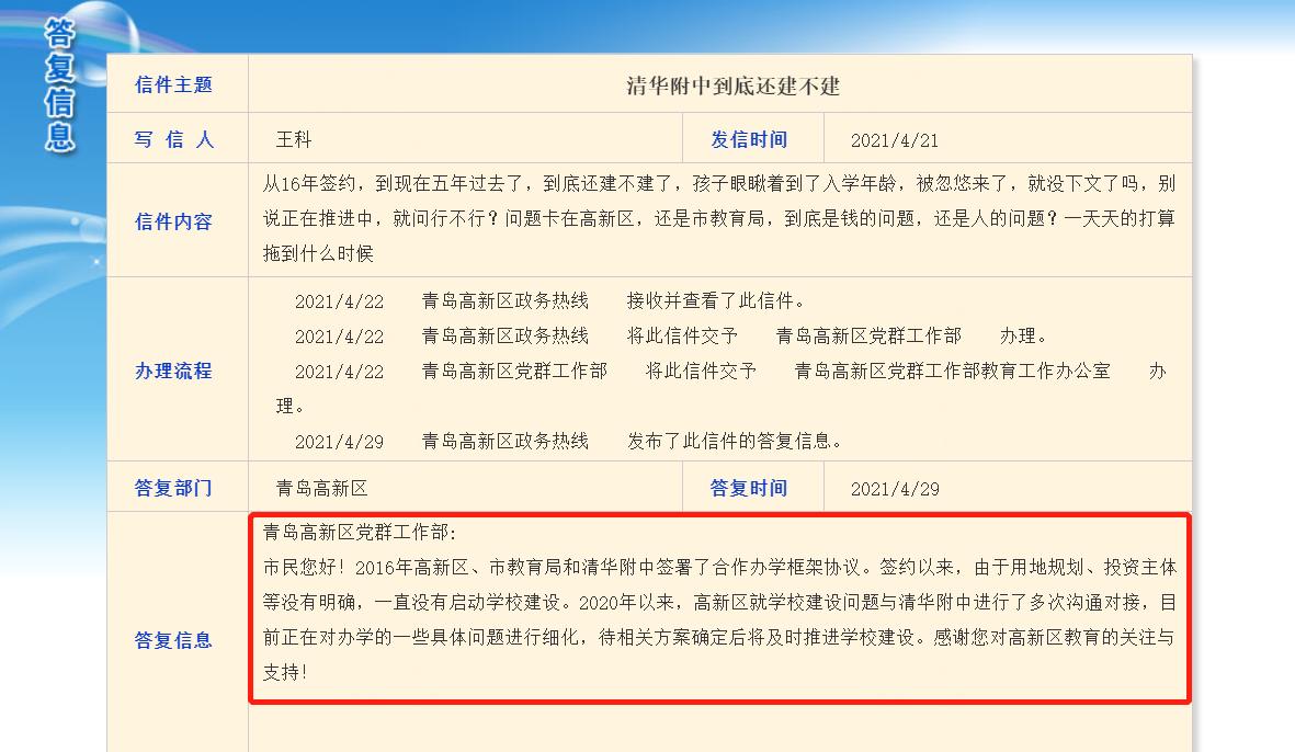 学校宣布落地以来,周边居民对学校建设的呼声非常高,据青岛高新区党群工作部年初透露,2016年高新区、市教育局和清华附中签署了合作办学框架协议。签约以来,由于用地规划、投资主体等没有明确,一直没有启动学校建设。今年以来,高新区就学校建设问题与清华附中进行了多次沟通对接,目前正在对办学的一些具体问题进行细化,待相关方案确定后将及时推进学校建设。