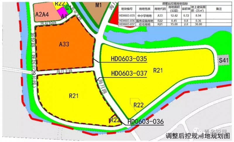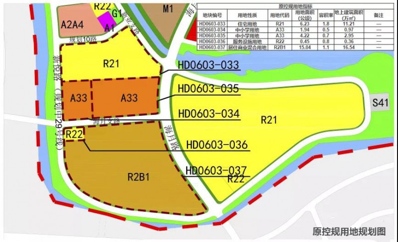 (1) HD0603-035地块用地面积为12.42公顷,由居住及初中、小学三块用地调整为中小学用地(A33),容积率拟调整为≤0. 72,其他控制指标相应调整。
