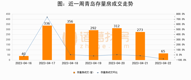 从存量房来看,2023年04月22日青岛存量房单日成交65套,比昨日减少208套,环比下降76.2%。从近一周存量房成交来看,青岛存量房日均成交套数为239套,04月22日单日成交65套,低于近一周平均水平72.8%。