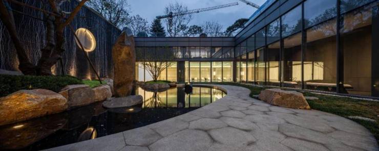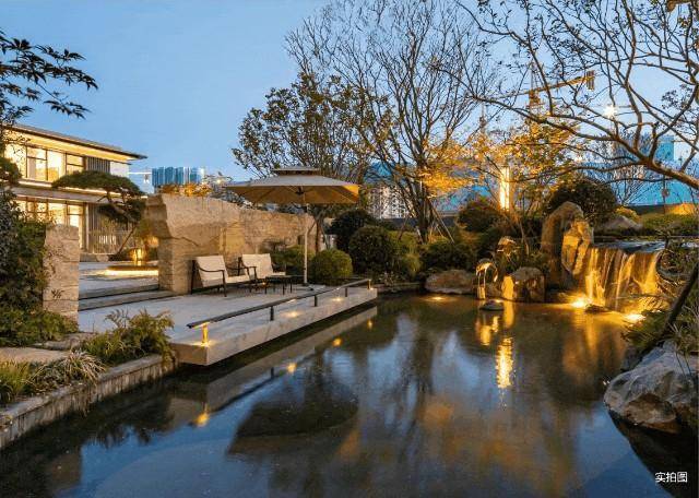 为提升业主身临观感,大手笔定制水幕景观墙,中间配合一轮圆月及灯光设计,庭中矗立着的河北黑石,名曰华楼,两侧种植的乌桕树和红枫颜值与品质兼具,与水幕景观墙结合,不夸张地说,这种立体的景观体系,未来不论是行走其间还是从楼上俯视,都不会觉得单调,呼应了人们接近自然、触摸自然的渴望。