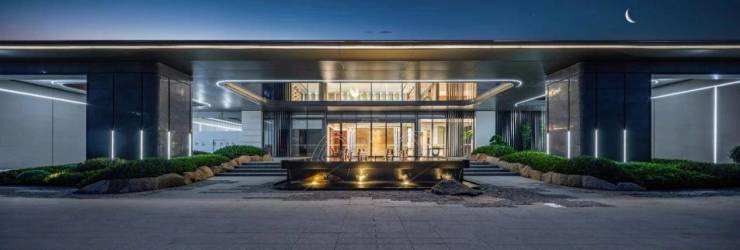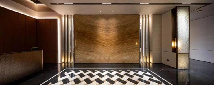 整地的天然石材组合、进口迎客松交织辉映及精心设计的动泉静水面,让品质设计怦然心动,进入大堂时候,约3.6米层高的归家大堂,硬朗的线条随着暖色光线,迎面而来的是一面天然波斯白玉整切而成的玉璧,宛若天然山河波纹流动,透露出低调经典,以及舒适的奢侈感。