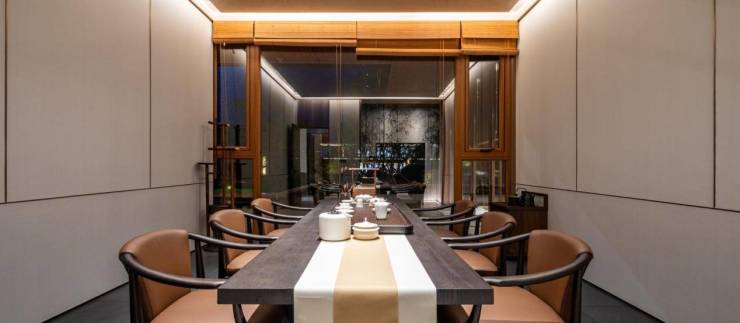 拾级而上,作为海信目前所有项目中最大的茶室,更是君澜同系-水石设计操刀升级打造,约207平的空间设立五个独立包间,甄选实木的外观架构,天然石材的迎宾前台,古色古香的几方会客空间,伴着溪流所带来的愉悦,或与友对饮,促膝相谈,可得茶之趣,在自己的小天地里,抿一口茶香,感受内心的宁静。