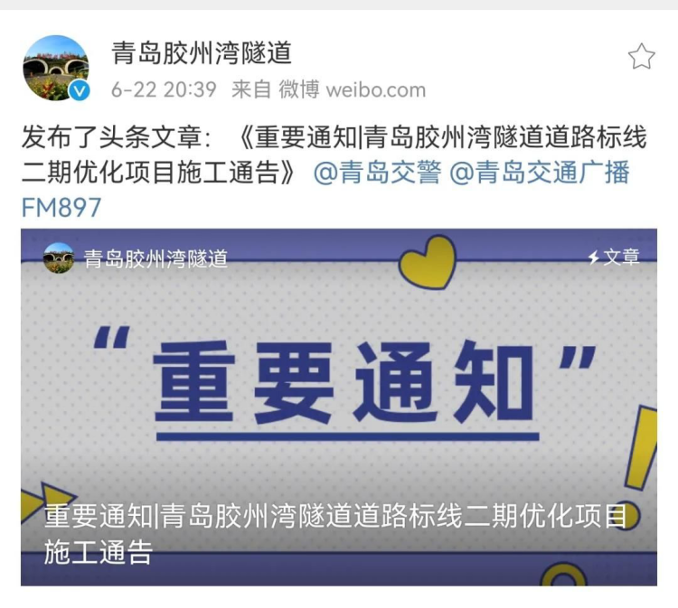 6月22日至6月29日每日22:00—次日6:00,青岛胶州湾隧进行道路标线施工作业,隧道部分车道临时封闭!