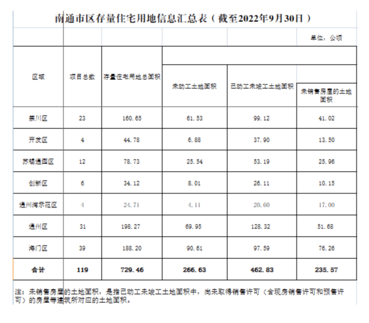 10月14日,澎湃新闻从江苏省南通市自然资源和规划局了解到,近日该局发布了《南通市区存量住宅用地信息汇总表(截至2022年9月30日)》,南通市存量用地总面积为729.46公顷。其中,未动工土地面积266.63公顷,已动工未竣工土地面积462.83公顷,其中未销售房屋土地面积为235.57公顷。