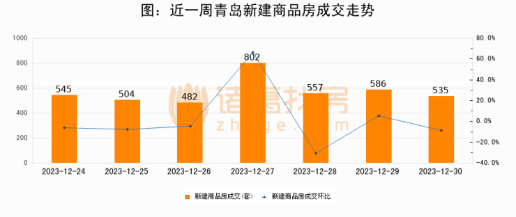 根据青岛市住房和城乡建设局数据显示,2023年12月30日青岛新建商品房成交535套,较昨日减少51套,环比下降8.7%