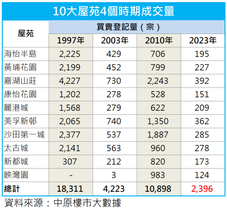中原地产亚太区副主席兼住宅部总裁陈永杰表示,中原地产统计的十大屋苑中,东涌映湾园跌幅最大,2010年全年成交多达983宗,去年跌至只有124宗,大跌87%;其次是沙田第一城,成交量由2010年的1887宗,跌至去年285宗,跌幅85%。曾有“炒家天堂”之称的天水围嘉湖山庄,2010年全年录2243宗成交,去年仅392宗,跌幅达83%。值得一提的是,1997年高峰期,嘉湖山庄全年成交量多达4227宗,为全港成交之冠。