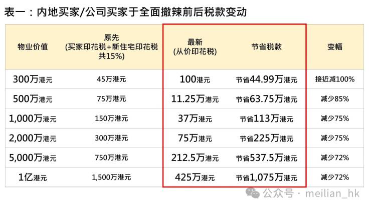以1000万港元的物业为例,非本地买家现在只需要缴付37万港元从价印花税,较原先辣税共150万港元,节省了113万港元。假若非本地买家或公司买家购买一间价值1亿港元超级豪宅,原先辣税共1500万港元,现时更可节省1075万港元的辣税,只需要缴付425万港元的从价印花税。