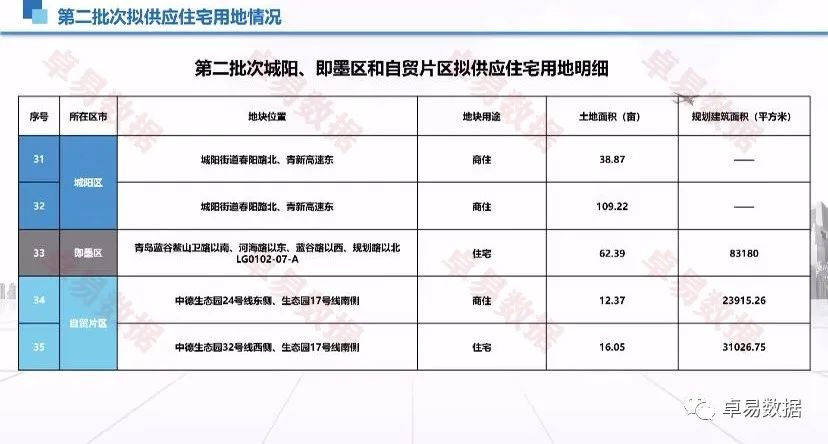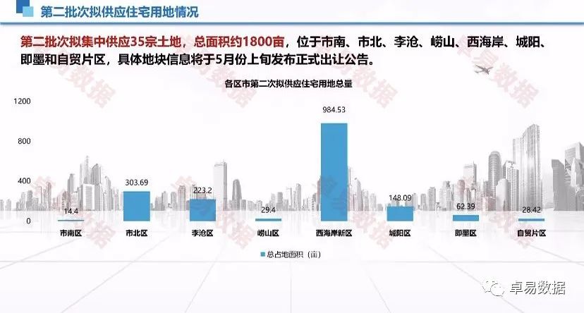第二批次拟集中供应35宗土地,总面积约1800亩,位于市南、市北、李沧、崂山、西海岸、城阳、即墨和自贸片区,具体地块信息将于5月份上旬发布正式出让公告。
