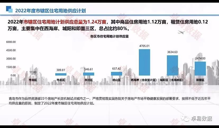 2022年市辖区住宅用地计划供应总量为1.24万亩,其中商品住房用地1.12万亩,租赁住房用地0.12万亩,主要集中在西海岸、城阳和即墨三区,总占比约80%。