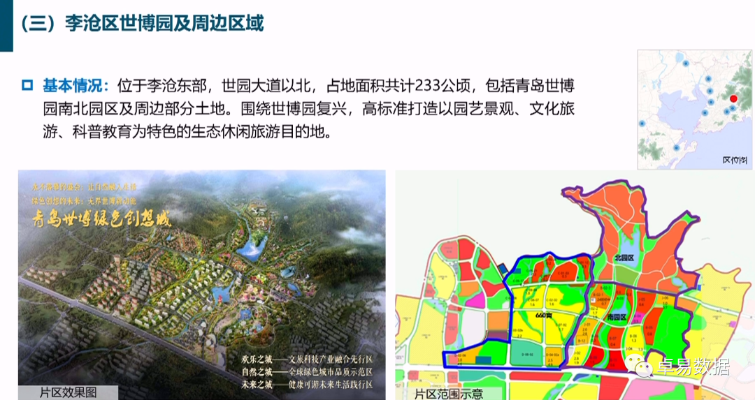 李沧区世博园及周边区域:位于李沧东部,世园大道以北,占地面积共计233公顷,包括青岛世博园南北园区及周边部分土地。围绕世博园复兴,高标准打造以园艺景观、文化旅游、科普教育为特色的生态休闲旅游目的地。