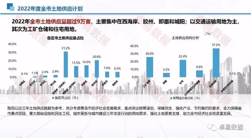 2022年全市土地供应量超过9万亩,主要集中在西海岸、胶州、即墨和城阳;以交通运输用地为主,其次为工矿仓储和住宅用地。