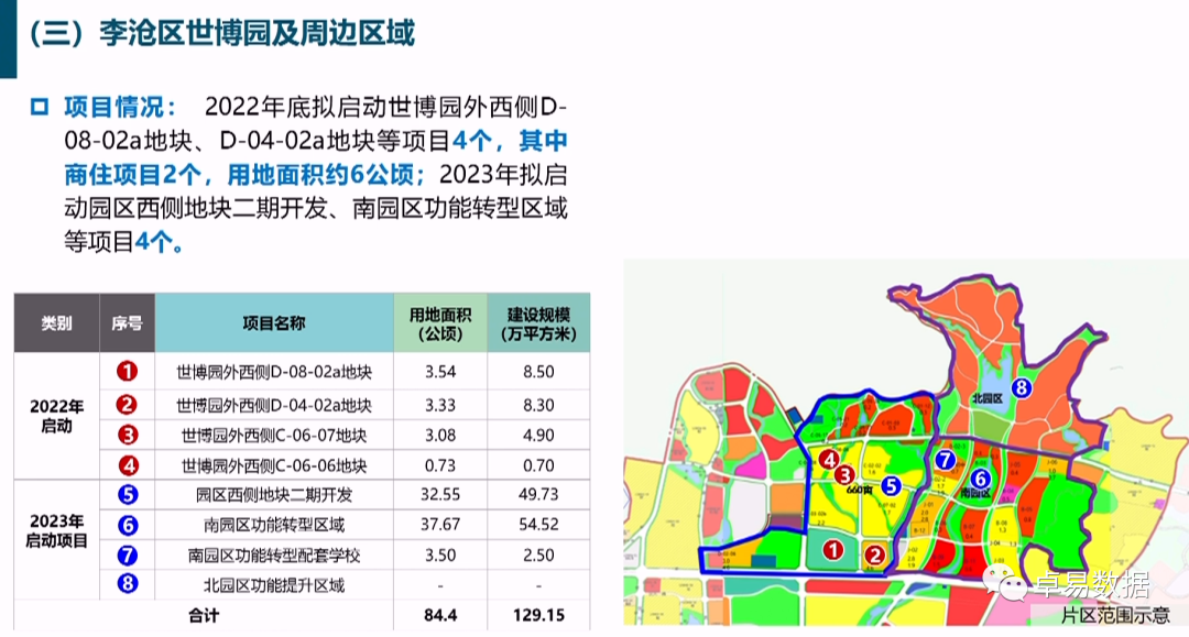 2022年底拟启动世博园外西侧D-08-02a地块、D-04-02a地块等项目4个,其中商住项目2个,用地面积月6公顷;2023年拟启动园区西侧二期开发、南园区功能转型区域等项目4个。