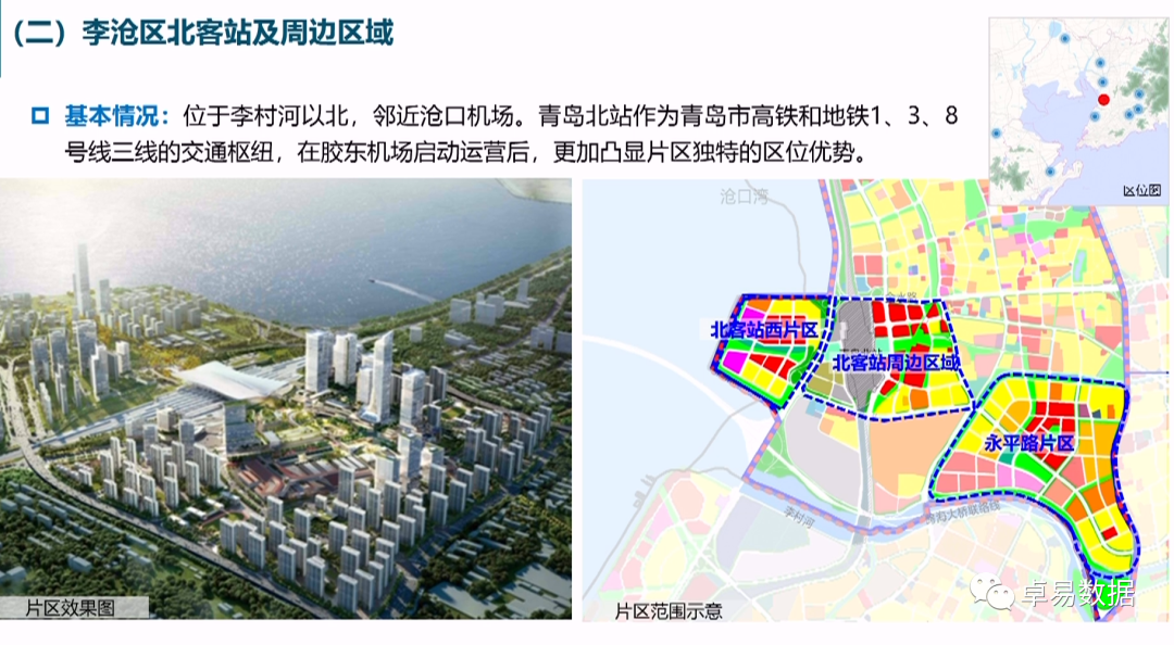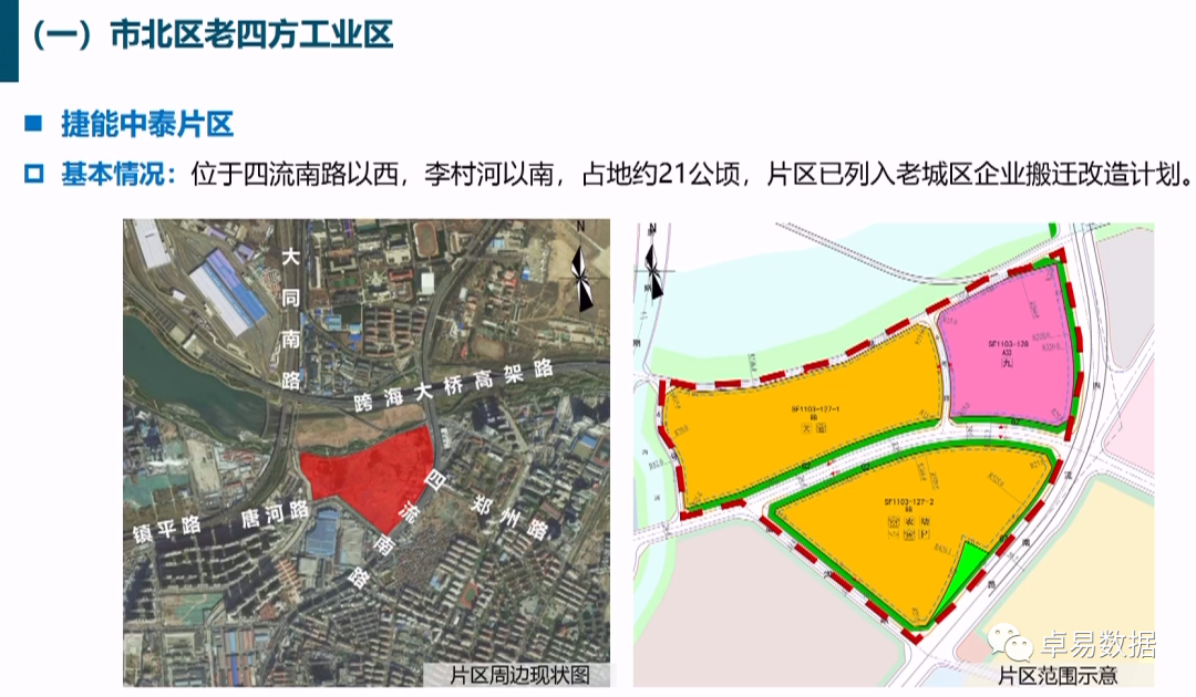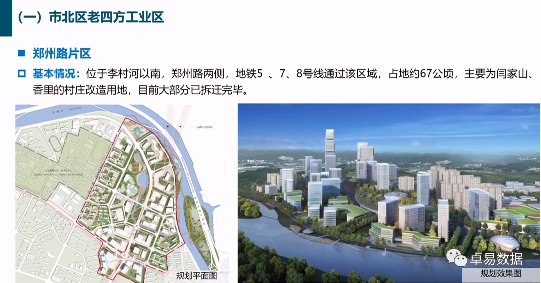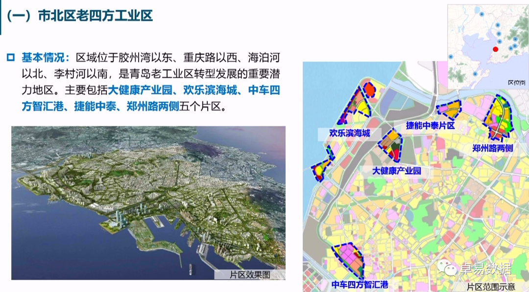 市北区老四方工业区:区域位于胶州湾以东、重庆路以西、海泊河以北、李村河以南,是青岛老工业区转型发展的重要潜力地区。主要包括大健康产业园、欢乐滨海城、中车四方智汇港、捷能中泰、郑州路两侧五个片区。