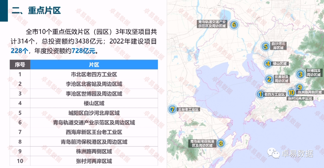 全市10个重点低效片区(园区)3年攻坚项目共计314个,总投资额约3438亿元;2022年建设项目228个,年度投资额约728亿元。
