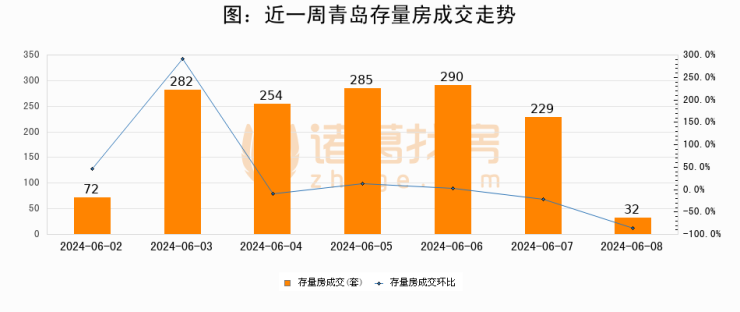 从存量房来看,2024年06月08日青岛存量房单日成交32套,比昨日减少197套,环比下降86%。从近一周存量房成交来看,青岛存量房日均成交套数为206套,06月08日单日成交32套,低于近一周平均水平84.5%。