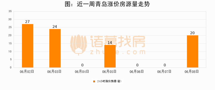 根据诸葛找房数据显示,青岛24小时涨价房源量为20套,较06月07日增加20套,环比上涨0%。与此同时,涨价房源占比小幅扩大,业主信心有所提升。