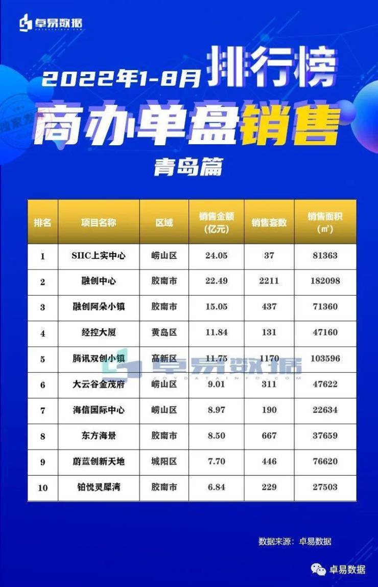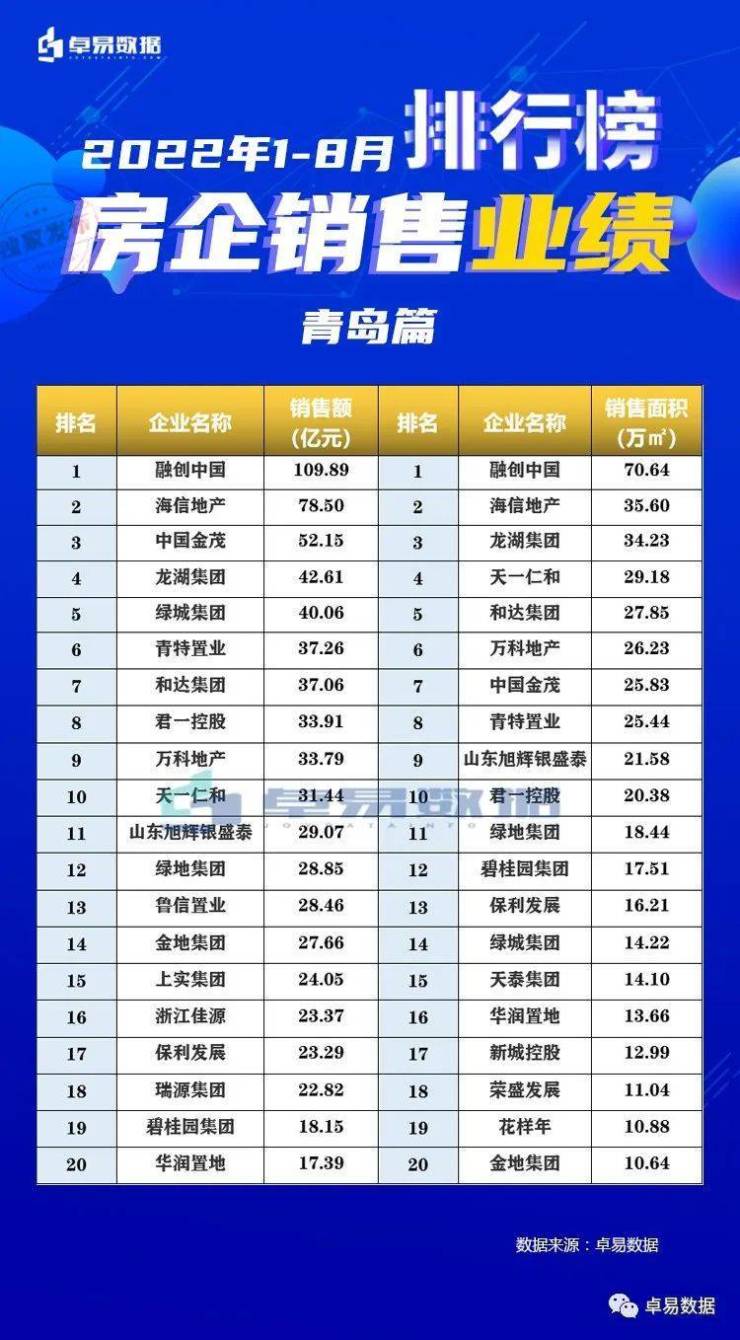以下是2022年1-8月青岛房地产TOP20具体销售情况以及单盘销售情况。