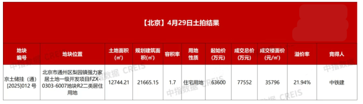 4月29日,北京市通州区梨园镇强力家居土地一级开发项目FZX-0303-6007地块迎来出让,经过219轮竞价(包含线上4次竞价)后,由中铁建以总价7.76亿元、成交楼面价35796元/平方米、溢价率21.94%竞得。