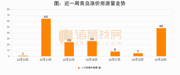 根据诸葛找房数据显示,青岛24小时涨价房源量为48套,较10月28日增加43套,环比上涨860%。与此同时,涨价房源占比小幅扩大,业主信心有所提升。