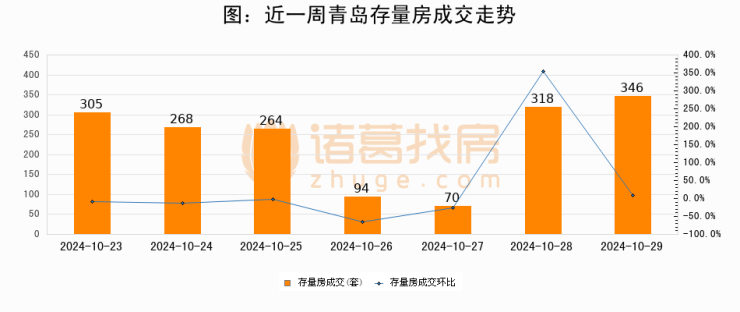 从存量房来看,2024年10月29日青岛存量房单日成交346套,比昨日增加28套,环比上涨8.8%。从近一周存量房成交来看,青岛存量房日均成交套数为237套,10月29日单日成交346套,高于近一周平均水平46%。
