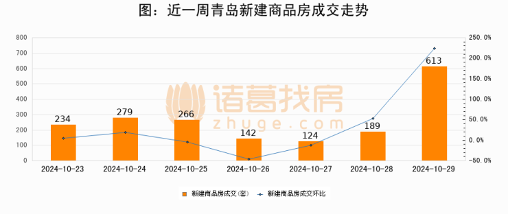 根据青岛市住房和城乡建设局数据显示,2024年10月29日青岛新建商品房成交613套,较昨日增加424套,环比上涨224.3%
