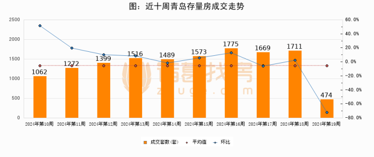 存量房方面,第18周青岛存量房成交474套,较上周减少1237套,环比下降72.3%。从近十周成交走势来看,周均成交套数为1394套,本周低于平均水平66%。