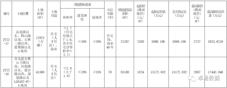 JY22-17地块位于站前路以东、鹤山路以南、石林三路以西、蓝鳌路以北A地块,占地12975㎡,容积率1.7,总建面21387㎡,其实楼面价2380元/㎡,最高限价2737元/㎡,起拍总价0.51亿。还须缴纳耕地开垦费13.719万