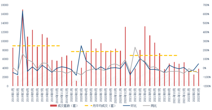 诸葛找房数据研究中心监测数据显示,2022年3月郑州新房成交3852套,环比上涨47.47%,同比下降52.21%。