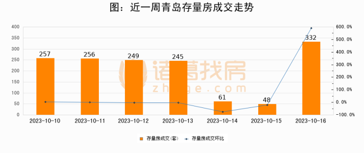 从存量房来看,2023年10月16日青岛存量房单日成交332套,比昨日增加284套,环比上涨591.7%。从近一周存量房成交来看,青岛存量房日均成交套数为206套,10月16日单日成交332套,高于近一周平均水平61.2%。