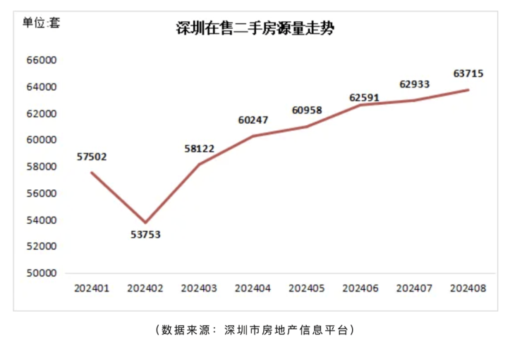 不过,当前二手房在售量仍持续增长。截至2024年9月1日,据深圳市房地产信息平台公开在售二手房数量统计,深圳全市有效在售二手房源63715套,对比8月1日统计的62933套在售房源增加782套,环比增长1.2%。