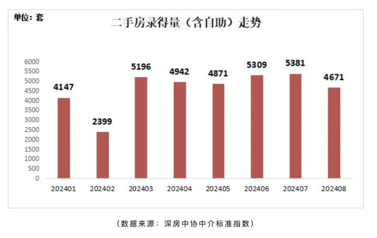 根据深圳市房地产中介协会统计,8月份,深圳全市二手房录得(录得量系指深房中协以二手房买卖合同发起时间为口径统计的数据,并非最终成交过户套数)4671套,环比下降13.2%,同比增长50.0%。