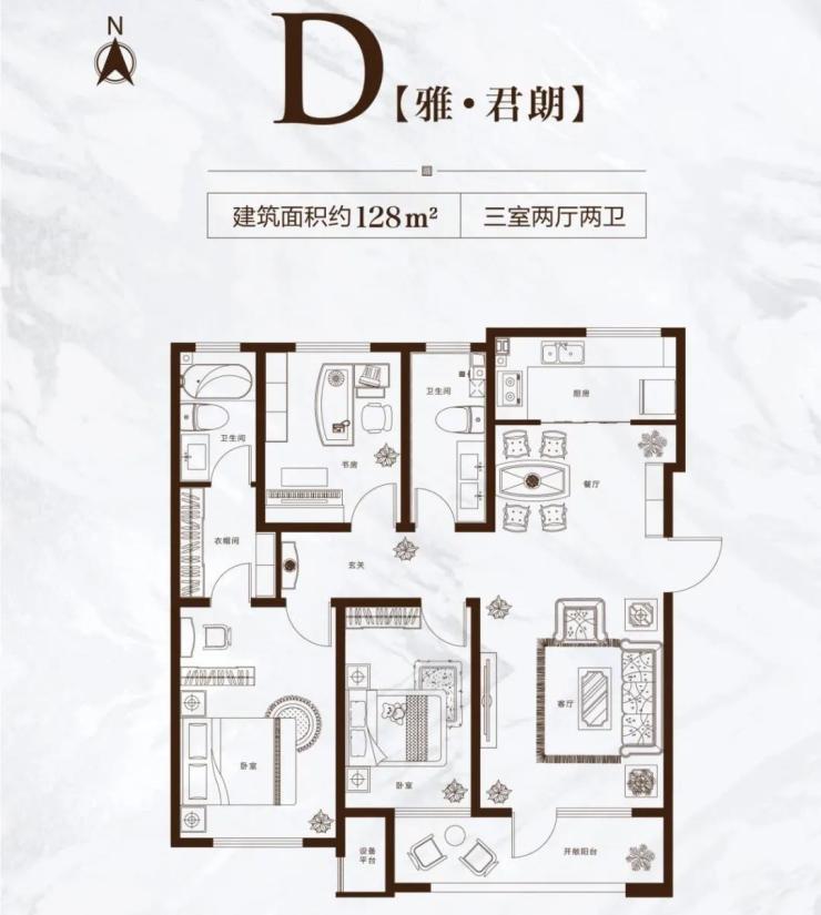 建面约128㎡三室两厅两卫户型,亮点颇多。三南向大开间设计,采光充足。卫生间双盥洗池设计,可有效解决生活早高峰拥堵问题。主卧从卧室到衣帽间到独立卫浴层层递进,自成一方尊贵天地,且自己就能实现南北通透,这在区域内十分罕见!