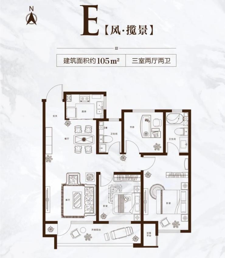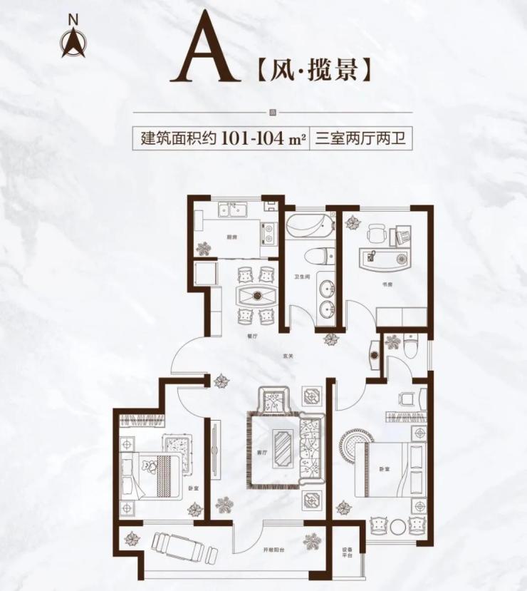 建面约101—104㎡三室两厅两卫户型,走廊大部分被囊括在客餐厅范围内,提高了户型整体利用率,使买房人的每一笔钱都能花在刀刃上。厨房、餐厅、客厅、阳台相连,合理动线增加了互动交流,造就家庭聚场的活力。