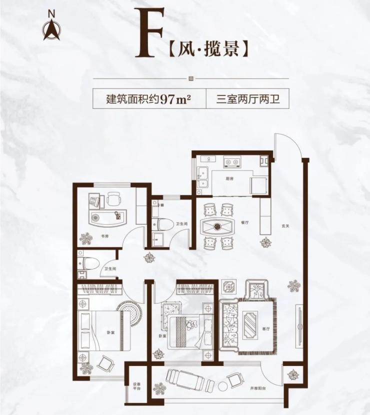 以建面约97㎡三室两厅两卫户型为例,该户型既保证了充足的大空间大尺度主卧套房,又实现了三室两厅两卫双阳台的优质配置。在购买力和优越的居住舒适度上做到了优质的平衡,空间感和使用功能丝毫不差。