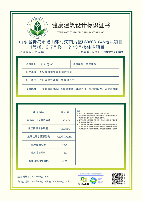 和樾府“健康建筑设计标识铂金级”证书