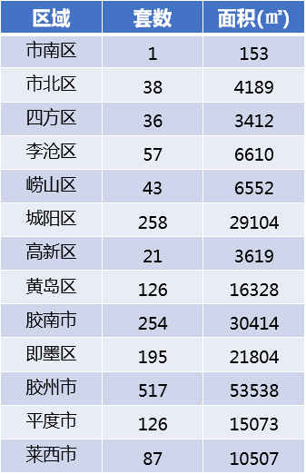 从各区成交情况来看,上周胶州市新建商品住宅成交517套,成交面积为53538㎡,位列上周各片区新建商品住宅成交面积和成交套数首位;原胶南市以成交254套,成交面积30414㎡的成绩名列第二;城阳区以单周成交258套,成交面积29104㎡列第三位。
