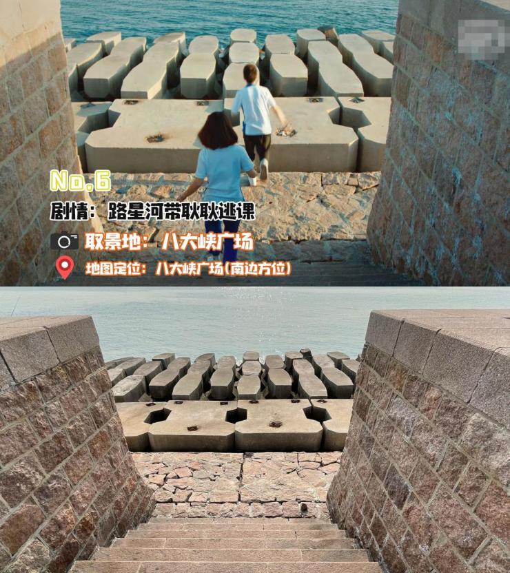 相较于其他热门景点,八大峡广场可以说是小众看海佳地了,乘公交车至附近车站下车,沿着西陵峡路往前走,便能看见广阔湛蓝的海面。若想寻到剧中海边石块打卡地,可以导航八大峡广场,然后沿着海滩一直向前走,途经篮球场后,可以看到一个向下的楼梯口,下去便可以到达目的地。